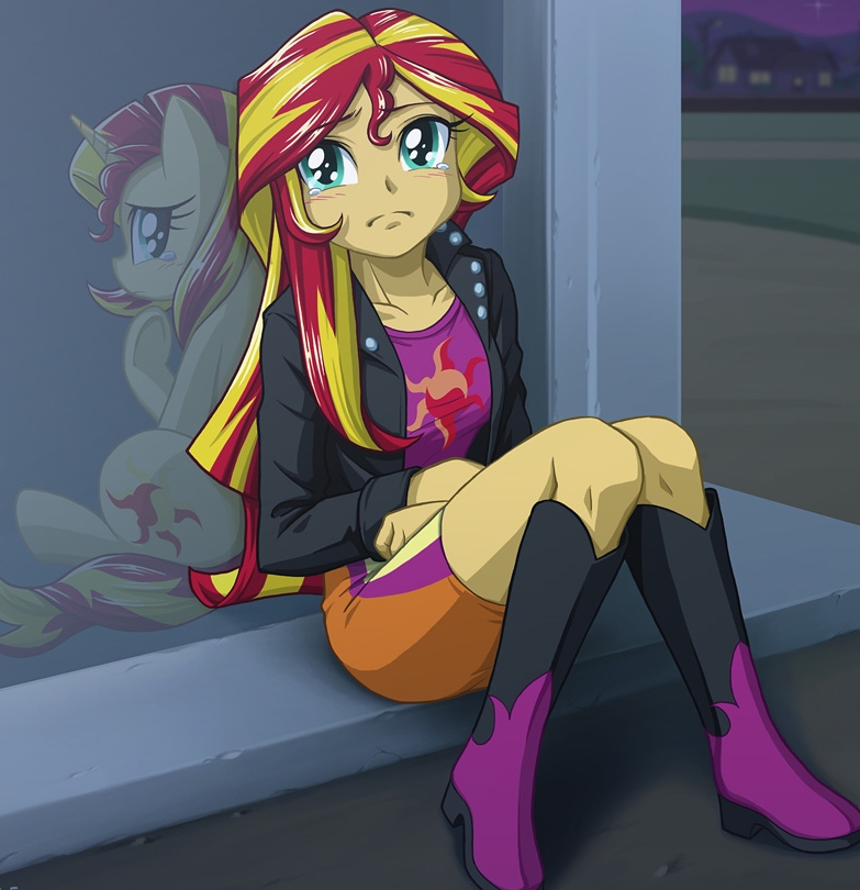 Sunset found herself on the front steps of Canterlot High. The sun began its final descent towards the horizon, and its journey cast a shadow over the remaining base of the Wondercolts statue, a shadow which was now beginning to engulf the young woman's seated position on the stairs, beckoning the chill of the late evening air. She gazed at her reflection in the base's north face, which contained the magical portal to Equestria. At one time, the portal was only largely active for only three days every two-and-a-half years. But due to the combined ingenuity of Equestria's Princess Twilight Sparkle and Pinkie Pie, they had figured out a method to maintain the portal, and it was now an avenue to come and go at any time, save for the day of the Friendship Games, when this world's Twilight Sparkle unwittingly captured the magic that kept it open.