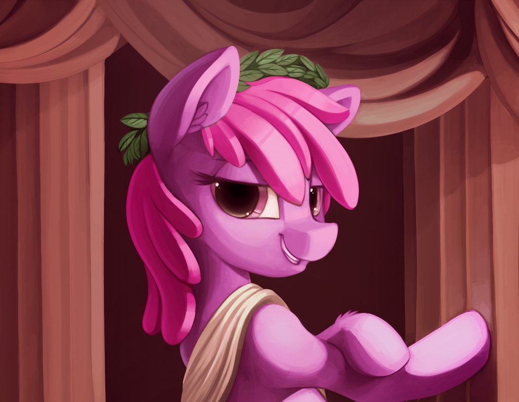 So here they were, on Nightmare Night, Ruby in her bumblebee suit, and Berry in her toga and golden wreath harkening to Equine Civilizations past; if she couldn’t drink, at least she could pay homage to a long-unworshiped deity of alcohol with a bedsheet and a prop from the Ponyville Schoolhouse theater collection she had convinced Ruby to borrow from Miss Cheerilee.