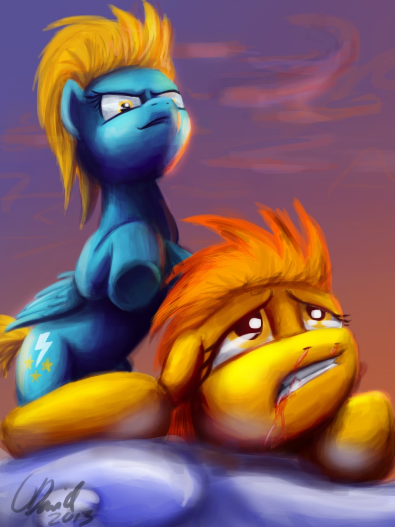 However, the captain of the Wonderbolts had not seen such rising talent for ages. Ever since she first joined the academy, all of the flyers there only reached to their top potential through years of hard work and honorable sweat. The two newbies were exceptional geniuses, with the rainbow one having performed a sonic rainboom once in a blue moon, saving her friend Rarity from the verge of a violent death, but also Spitfire herself. Not only that, she had performed it again during Princess Mi Amore Cadenza's wedding with Shining Armor, also a captain of his own army, so it would be reasonable for Spitfire to break down when the young mare had officially declared the end of her desires.
