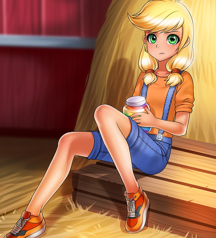 However, you and Applejack were very close to each other, to the point where you could feel Applejack’s breath through her nose. This was the moment you saw the cute little freckles on her face. For some reason, you began to feel hot. You could see Applejack blush. She then placed the jar in-between you and her.
