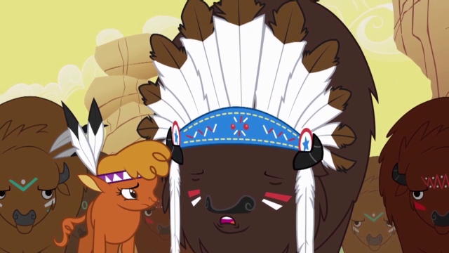 Immediately, all four of the ponies turned in unison to find, to their surprise, that the largest of the buffalo was walking towards them. He was clad in an ornate feather headdress, giving the clear indication that this was someone of authority amongst the buffalo. But what was more important right now was that he was limping badly, with one of his back legs bandaged heavily. So bad was it that one of the nurses soon rushed over to him.