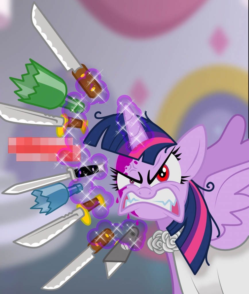 The air shimmered as Twilight cast another spell, a combination summoning/conjuration. Dozens of implements, from knives to swords to something that was most definitely not meant for cutting (it was vibrating), materialized in front of her. Celestia took a step back, then another, until she found her rear end smooshed up against a pair of half-adorned ponnequins.