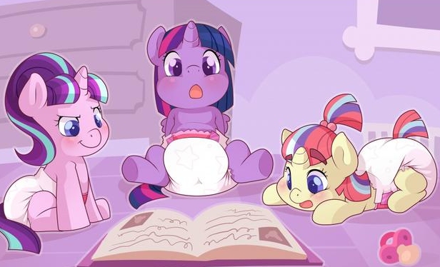 The three stayed silent for a moment, looking at each other as the daze wore off. “M-Moondancer what did you do?” Twilight whined, looking down at herself in surprise. The three magic users had somehow become foals and were now diapered up in thick padding. The plastic fronts of their diapers each had their cutie marks shown on them, and leak guards matching their coats that curved around their tiny chubby back legs, with some frilly fabric peeking out as well.
