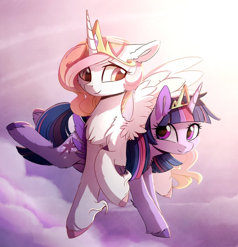 Celestia, who flew beside her with something that gleamed like starlight but was oh-so-cold on her head in their sleepless existence and smiled forever was all she ever wanted. Except, there were times when Celestia's lovely bone-white face did not smile so, and that's when she made small sounds. Whimpers would leak from the radiant mare. They'd slow but never stop, just like their flight. She would wrap her stiff purple forehooves around Celestia, telling the mare who never said any words to go on. Every time she repeated words, they sounded stiff with her voice when she spoke them. Most of the time, she merely parroted Celestia's own words to her so they might keep going to anywhere.