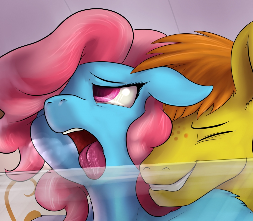 At last, Carrot let her go, and Cup turned to face her stallion. His hand caressed her cheek, and then he leaned in. Cup welcomed the kiss with an eager mouth, and the two ponies proved their prowess in the art of lip-locking after years of practice. By the time they withdrew from each other, both Cakes were panting for breath, their eyes gleaming with anticipation and hunger. They dove back in for another quick kiss before Carrot turned back and reached out his hand toward the shower again. Satisfied with the warmth of the flowing water, he said quietly, “It's ready,” then slid his thumbs into the waistband of his boxers and slid them to the floor in one quick motion.