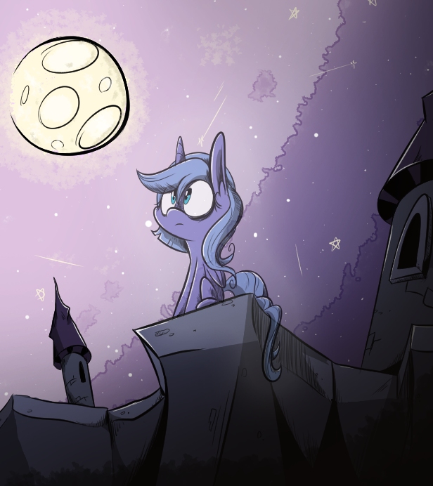 Looking out at all the world that she could see, wondering at everything, Luna felt the first drops of a drizzling rain on her back from the passing Everfree rain clouds that obeyed nopony. The melancholy atmosphere was completed, in her mind, and she let out a heavy, wistful sigh — one that seemed too heavy for such a small child. So much would be new tomorrow, and even more, after that, even if nothing would change. Excitement and gloom in almost paradoxical equal measure, Luna scooted into the shadow of another tower to stay as dry as possible. Then, she turned her gaze to the moon glowing above her.