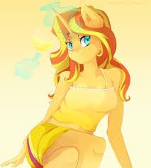 Sunset giggles again and tackles you onto the ground. You both start laughing before nuzzling each other nose to nose and gave each other a peck on the lips before she gets off of you. She levitates a bottle of fruit punch she had bought from Berry Punch and pours it into hers and your cup.