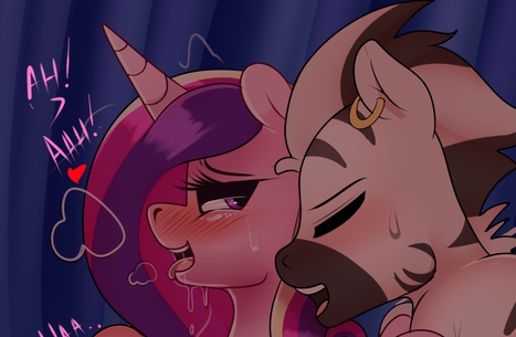 “Right…” Cadance breathed, her voice now more shaken up than ever. Her eyes slowly drifted back to the zebra’s third leg as she hoped the Zebra couldn’t hear her rapidly beating heart. Upon a closer inspection, she noticed his cock wasn’t even slightly hard… Yet, even so, it’s length nearly came close to Shining Armor’s… She shuddered to imagine how long it would be at full mast. Would it even fit inside her?!? No… she shouldn’t even be thinking of such things! It… it didn’t matter if it would all fit snugly inside her walls… that wasn’t even remotely important!