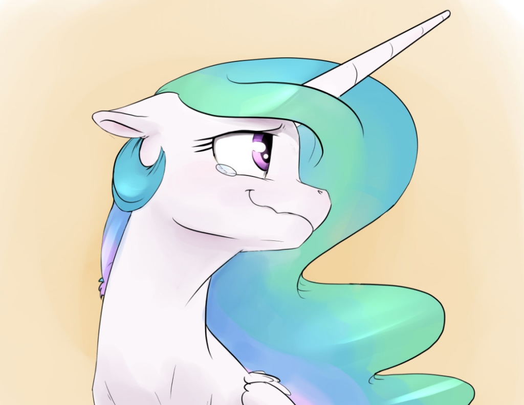 She didn't swallow. She stayed calm. Celestia's heart pounded so hard in her chest that she thought it was desperately trying to escape. Her ribs ached with a nervous breath. The only signs of disarray were the trails from the tears running down Celestia's cheeks and the patches of her coat that were mussed up. Her mouth was tugged into a smile that hurt her cheeks a little more than it should.