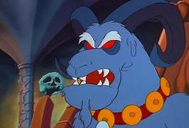 “ENOUGH!” The whole room fell silent as a thunderous bellow echoed out from the mouth of Grogar. The giant goat rose up from his seat, looking absolutely furious as his horns crackled with a greenish-white energy. The bell suspended from his collar shone brightly, sending streams of energy over the brass plates surrounding the goat’s neck. Before the two brawlers could even look up at their master, two shafts of raw power shot from the tips of Grogar’s horns. The bell let out a hollow chime. The Troggles vanished as their bodies were enveloped in a blazing explosion, killing them instantly. For some time after this, everyone stared at the pair of burning carcasses that lay in the middle of the room, as if it were some kind of funeral pyre. Grogar growled loudly as he sat back down.
