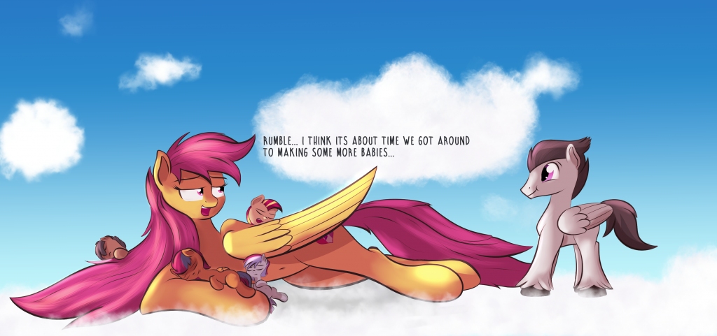 “C’mon, I can’t just simmer down after THAT!” Scootaloo pressed on, wiggling her huge flanks at Rumble. “Help a mare out will you?”