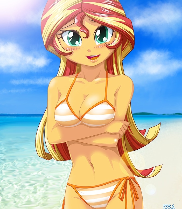 “Thanks, Rarity!” Sunset beamed. As she took the gifted two piece, her eyes couldn’t help but linger on her friends. Each of them had their backs to the center, casually stripping down into their birthday suits… except Fluttershy, who appeared as though she had shrunken down in a corner and was waiting for everyone else to leave first. Shirts were being carelessly discarded onto the sand below, a range of different colored bras were unclipped and followed them shortly after. Sunset knew it was impolite, and that she shouldn’t, but she couldn’t help but stare. Not that she managed to see much, mostly a heap of what others would call ‘side boob’ along with a generous display of finely shaped rear ends. Still easily enough for any of the guys in their school to kill for, just to earn a single look. She began to quickly rustle her own clothing and undress, so as to not be caught staring idly at her oh so attractive friends.