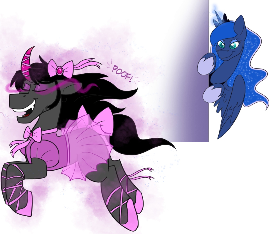 Luna looks far too confused now. "Oh...?" Furrowing her brow, she looks at me with it so obvious in her eyes. "Pink is the color for mares and mare-things in this age though, is it not? ...I thought you would look cute." Her foreleg meets the ground again. "I apologize for being so terrible with feminine fashions; they are truly mind-boggling to me. Is it any wonder Tia picks out all my dresses? They are absolutely no fun," she pouts and by Tartarus' flames that pout always gets to me. Suddenly, her face brightens and she jumps a little, feathers fluttering, laughing softly. "At least I have you! Sorcery, sword, and solitude for us, aye?"