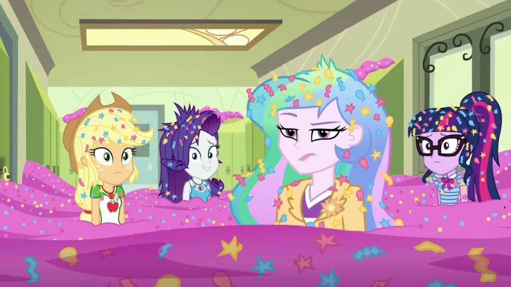 Canterlot High School had, it must be said, experienced more than its fair share of hectic and chaotic days, and today appeared as though it had gone through yet another of such moments. The main hallways of the school, which the students and faculty tried to keep as spotless and pristine as possible, now appeared as though a complete riot had passed through it. All over the floor, stuffed in lockers and even stuck to the walls, there was a veritable flood of confetti, of every single colour of the rainbow, though it appeared to be predominantly pink. This was one heck of a mess to have to deal with, but, thankfully, there were a few here who were indeed dealing with it at this very moment. Pinkie Pie, the girl who had set this chaos in motion to begin with, was down on her knees, with a dustpan and brush in her hands, trying to sweep up every single piece of that confetti she could see. But, she was not alone here today, as all of her friends were here to help. For a time, nobody said a word, but, it eventually fell to Pinkie to break the silence between them.