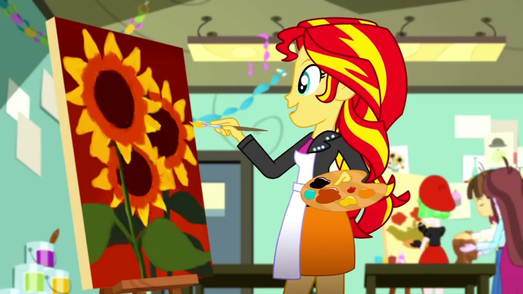 The classroom used for art classes was, as you'd probably guess, as colourful and vibrant as a room could get. With every direction one looked, there was a plethora of bright colours, impressive images, or just people looking fondly towards the paintings they'd created. There were all sorts of paintings being done here, from still life images, to portraits of students who were trying really hard not to sneeze, to really out there concepts by the more artistic members of the class. But, in spite of the clear passion these boys and girls all had for their art, there was nevertheless a quiet and calm to the room, as everyone simply focused on what they were doing, never straying to the work of others or trying to interrupt anyone. Among these focused artists was Sunset Shimmer, who, as always, was busy trying to create her favourite subject, sunflowers. She smiled to herself as she made every careful stroke of her brush, making sure to get exactly the placement she wanted.