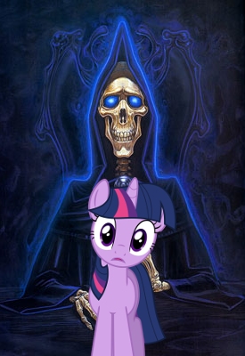 “Oh…” Twilight looked the visitor up and down again. “I don’t recall having any friends who are skeletons with black cloaks and glowing blue stars in place of eyeballs, but then again I do have a lot of friends in at least two different worlds and it can be difficult to keep track of them all. Forgive me for being impolite in forgetting, but may I ask, who are you?”