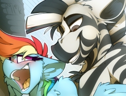 The large zebra moved at a faster and harder pace. His cock beat in and out of Rainbow’s pussy, rubbing her sweet and sensitive spots. The mare could only moan and pant, she could barely form any thoughts, but amidst her pleasure, a small part of her felt...unsatisfied. This zebra’s massive cock was hitting at her cervix, yet wasn’t going past that. She knew she could feel even better. She knew it, and yet didn’t want to beg for it; to amidst defeat. It was all beneath the awesomeness that was Rainbow Dash. But this thick dick was making her pussy scream for more. She wanted to be fully fucked. But that would mean admitting defeat. Stripes grinned wickedly, only giving Rainbow’s womb a deep with his cock as he moved. He wanted her to beg for it. And he could feel how close she was to breaking.