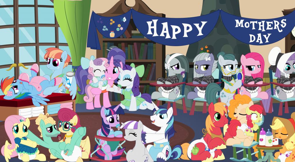 The crowded dawwed and clapped as Luna got up “excellent now come on down.” Applejack lifted little macintosh on her back with him teething on her mane while Apple Bloom bounced off with the bucket filled with foam apples in her teeth. Rarity and Sweetie Belle both came onto the stage next n their adorable little dresses as the older sister proclaimed “I waiwty gonna show you my new foal designs!” she lit her horn and she poofed her sister into giant thick pink diaper then placed a pink foal bonnet on her head making her giggle bouncing up and down in her new padding.