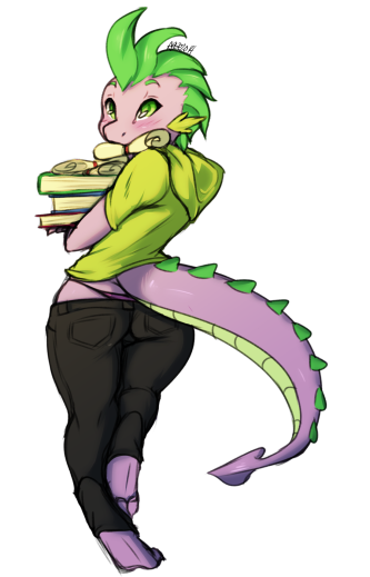 "Well...if I had to think about it..." Smolder contemplated, looking Spike's body up and down. "Maybe because you've been raised around ponies this happened." Spike had no idea what she meant, so she continued. "You see, when a dragon hatches, their gender is determined. So you were born male, and me female. But that's not the end of a dragon's growth. i was raised by dragons and hung out with tough females like Ember. So when I molted, I still had all my female parts." She then patted her flat chest through her tank top shirt. "But I never developed any breasts. Even Ember only managed a small C cup. But since you were raised around ponies, it probably caused you to turn all feminine."