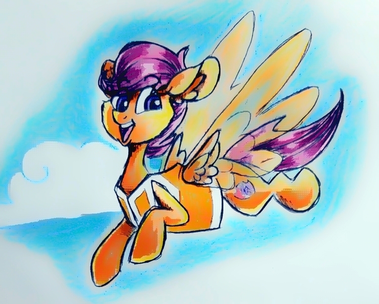 Something flashes, light glinting off the vest in a thousand colors. Scootaloo yelps as her hooves leave the stone and she’s held aloft. Wind rushes around her, tossing her mane and tail about. It’s not frightening, it’s gentle. Orange feathers, summoned from seemingly nowhere, surround her, blinding her. Her pulse races and she almost hyperventilates. Don’t be afraid, this is your gift. The voice, an unfamiliar stallion’s, enters her mind and she takes a deep breath to calm herself. The feathers part and she blinks against the bright sunlight.
