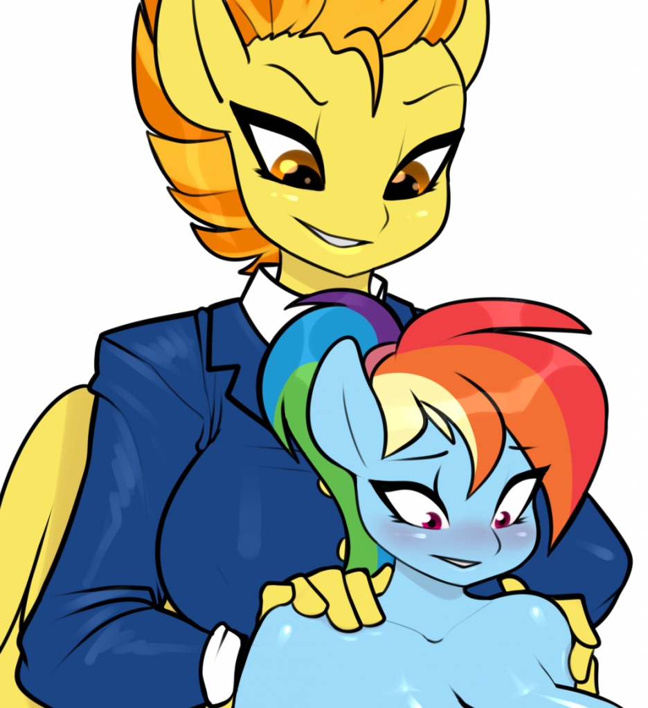 “Shut the door Dash, I need to speak with you,” Spitfire calmly stated, her chair lazily spinning around to face the young mare. She had to admit, Dash was quite easy on the eyes. The Wonderbolt’s outfit was skin tight, designed for practicality and to reduce drag while in flight, leaving perilously little to the imagination. Dark blue, with yellow accents, it clung to her athletic frame. The way the blue pegasus’s sculpted abs and A-cup bosoms complimenting her svelte physique was quite appealing as well. Dash’s rainbow mane, pulled in a tight ponytail atop her head, framed the her sky blue face and ruby colored eyes.