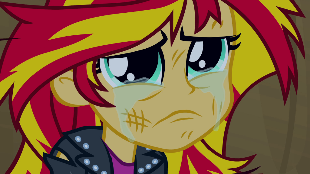 Sunset's eyes were full of tears as her right hand came up, holding a gleaming object.