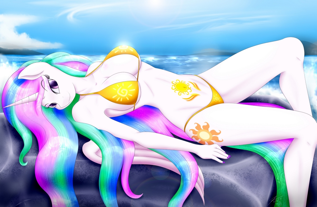 She proceeds to take off her bikini, both her top and bottom piece. Her big-ass breasts bounced slightly while her butt just as she stepped out of both of her bikini pieces. She kneels down and takes your swim trunks off, exposing your erect penis in front of her. She licked her lips in anticipation. Celestia moves herself to where she's facing your cock and you were facing her huge, jiggly ass.