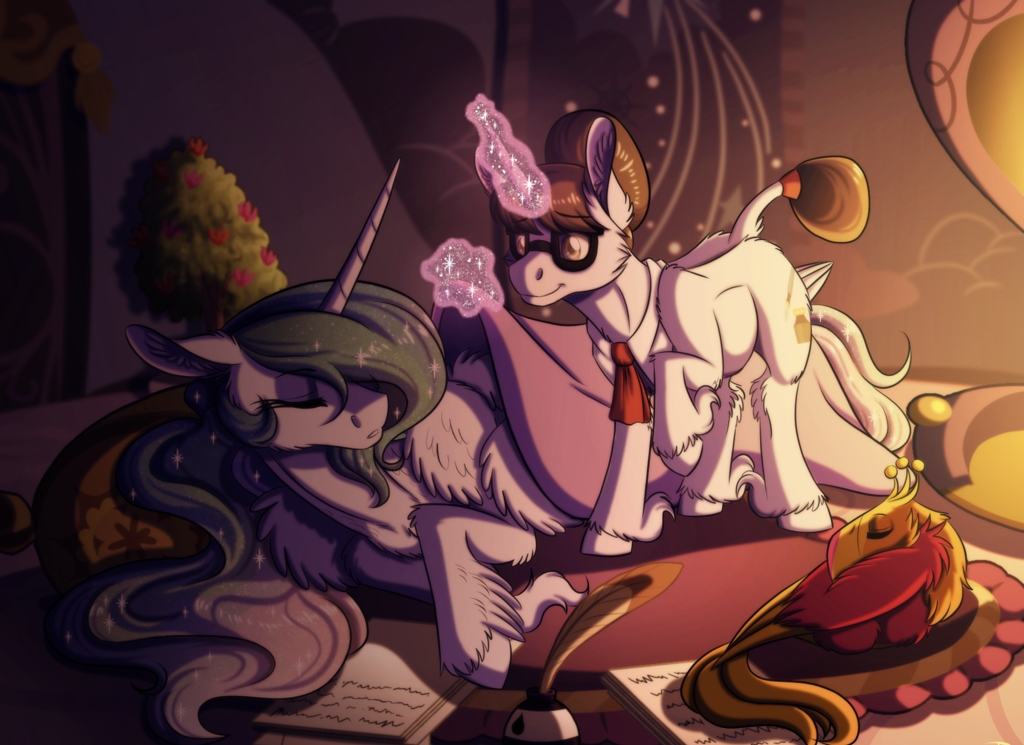 Somepony had gone and spilled the princess on the floor! The great, pale mare was spilled across her the pillows of her writing room. All was so quiet that the only sounds to be heard were Raven's quick and quaking heartbeat and the soft churs of Philomena, who was curled up next to the shockingly regalia-free Celestia. With every little sound from the phoenix, the fire stirred and embers crackled faintly.