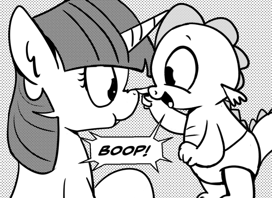 Spike kicked about helplessly at the attack, pushing on Twilight’s head. “Haha! No, stop! Hehe!”
