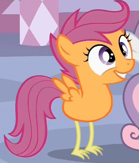 Instead, in front of her amazed eyes, Scootaloo underwent quite the dramatic transformation. Her neck sprouted a wattle. Her mouth became a beak. Her wing plumage covered her entire body. There's dramatic makeovers, and then there's this.