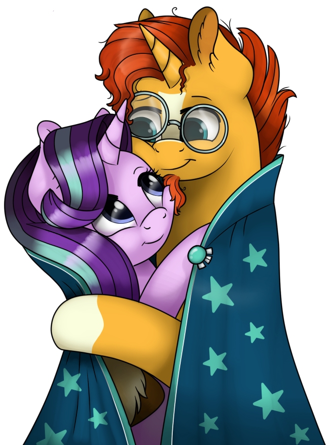 Starlight smiled and blushed, looking into Sunburst's eyes. He smiled back at her, then levitated his glasses off his face and set them by the lamp on the bedside stand.