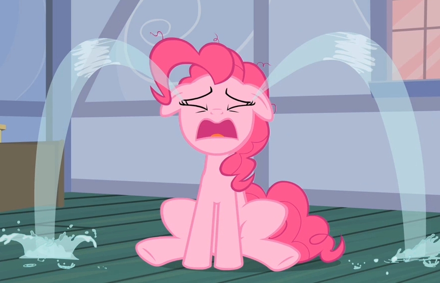 Holding on to my white hat with a design of my friends' Cutie Marks on it that Rarity made for me, so it wouldn't fly off my head as I ran, I busted through the pink doors to Sugarcube Corner. By its front desk that held some cake with pink icing, I saw Pinkie sitting on the floor, still screaming her head off. But, I gasped when I saw tears pouring from Pinkie’s eyes in a stream and formed two puddles in front of her.