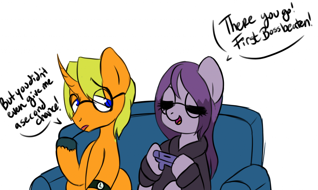 “Dammit, every time! Bleh, I’ll try again…” he muttered while reaching to pick the controller up again. Before he could get the controller, though, Nomi had grabbed it, hopped over the couch, and landed on the opposite end from Clocky, playing on the unicorn’s save. “Hey! Nomi, I was gonna-”