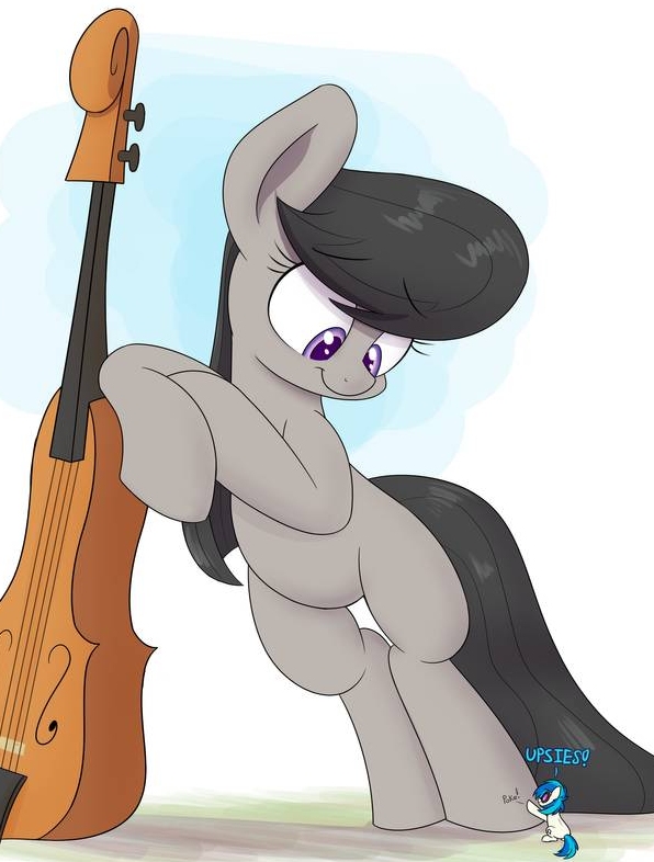 Her ear perked up at the sounds of her cello drifting through the bedroom door, and she lifted her head to the banister, seeing Vinyl quietly experimenting with the strings. Her skill was growing obviously, and the music she was crafting, while far from expert, was much more finely tuned then when she had last been heard playing in the market. Upon noticing Octavia, she yelped and dropped the cello loudly.