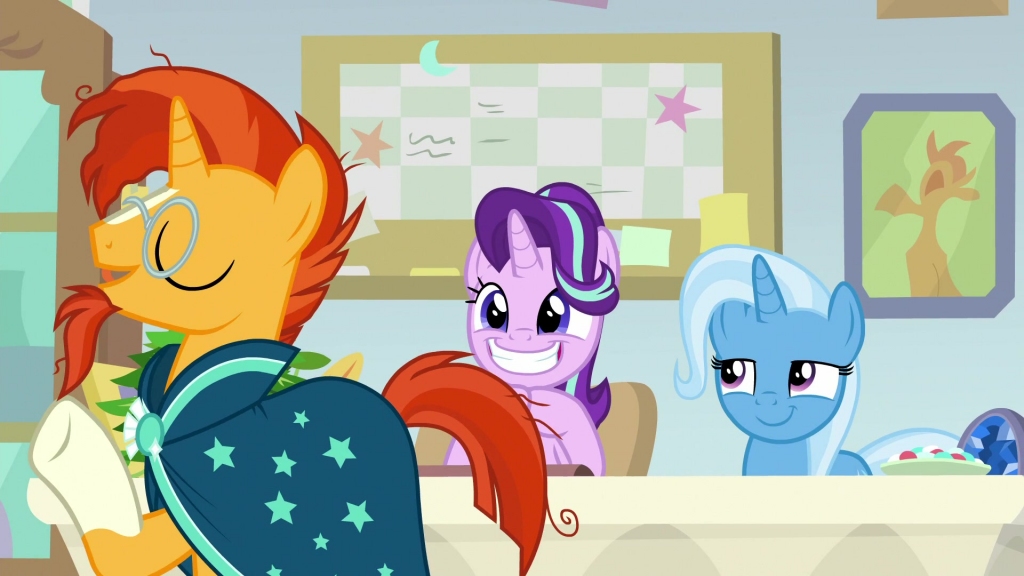 "Oh, nothing much," Trixie replied, looking Starlight dead in the eye as she flexed her magic up and down Sunburst's shaft until he was rock hard, "just that perhaps now that Starlight is going to be headmare, we should break in her new office..." she smiled at her marefriend.