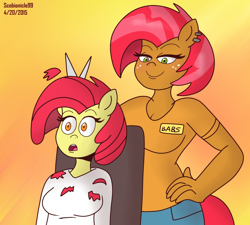 "Yeah, but he's a stallion! That's the difference!" Babs said as if it were the most obvious thing in the world. "Like Mom always said, 'two halves can't make a whole without a pole'. It's just us gals here. As long as there isn't a penis involved, we ain't making no retard babies. So whatever we do, it doesn't count as... you know... that! Tell me I'm wrong." Babs crossed her arms confidently and waited for Apple Bloom to try to come up with a retort.