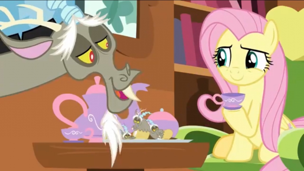 "Discord!" Fluttershy interrupted, "I thought we agreed not to discuss that thing that you never saw," she said sternly, eyes locked menacingly on the lord of chaos. All three Discords recoiled from her glare, deciding in unison to drop the subject immediately.