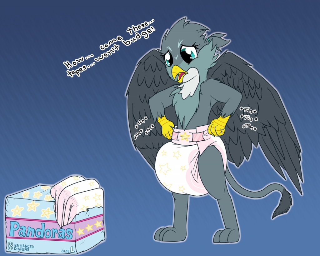 The griffon was dumbfounded when the mare easily pulls the tabs loose sliding the diaper open. “B-but how?! Rarity couldn’t get it off!” Gabby asked kicking when some wet wipes were applied to clean her rump.