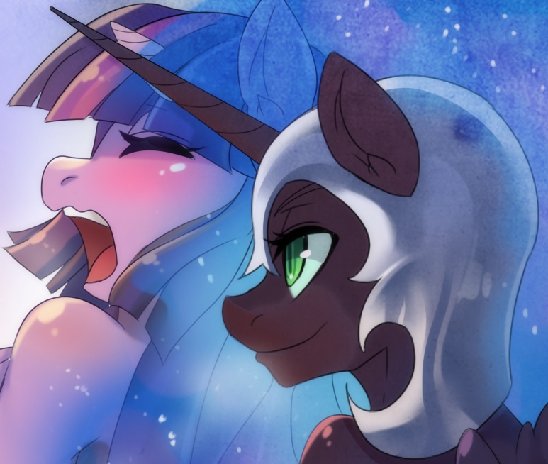 She was quite used to Nightmare Moon’s possessive groping by now, even flattered by it a bit. It was strangely thrilling to know that among all the mares in Equestria she was the one to be chosen by the powerful alicorn as her personal fuckpet. Nightmare Moon had no shortage of praises for Twilight’s beauty too, even if they were given in her own, quite demeaning fashion, interspersed with insults to Twilight’s intelligence and character.