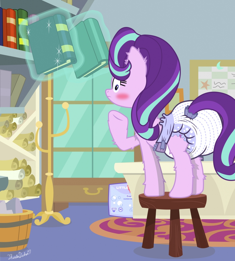 Starlight moaned quietly as she once again shoved her diapered crotch into the bear that had been wedged beneath her and the mattress of her crib, which had been teleported back to her bedroom after she had adamantly refused to be changed in front of Trixie's class. She figured that once the counselor had her class wrapped up, she'd be back to get her cleaned up, so why not have a little fun in the meantime?