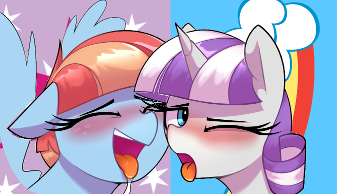 Weak, muffled noises left Velvet’s lips as she tried to voice her enthusiastic agreement. And while the exact meaning of her barely audible words escaped Rainbow’s mind, the light vibrations that Velvet’s vocal cords sent into the pegasus’s sensitive ballsack were definitely well-appreciated.