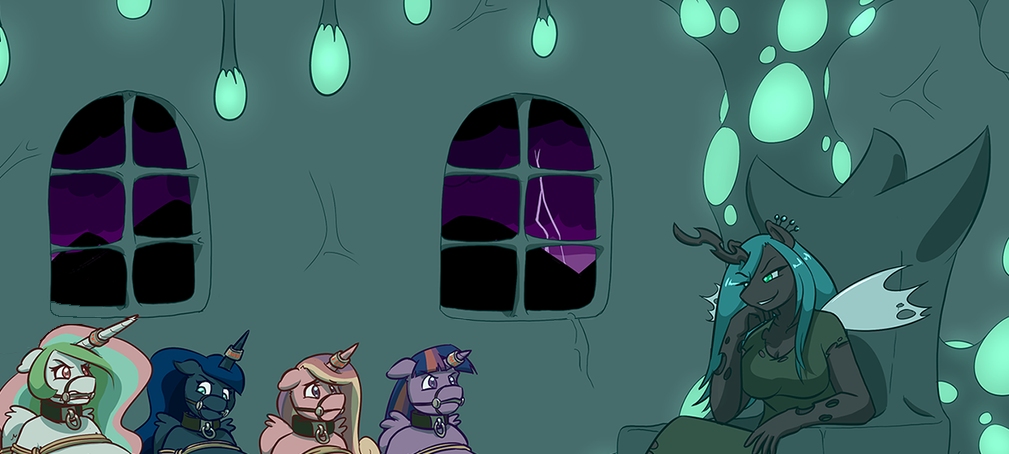 “You see, with all of the changelings from my army defecting to your side, I’m going to need a new set of them,” She explained, slowly walking over to stand above her captive princess, “And you’re going to help me make them,” She finished with a sly grin.