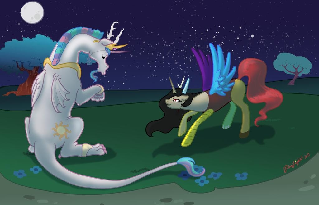 Nightmare Moon huffed heavily, and it wasn’t from exhaustion. “I shall charge him from the left and you from the right. Agreeable?”