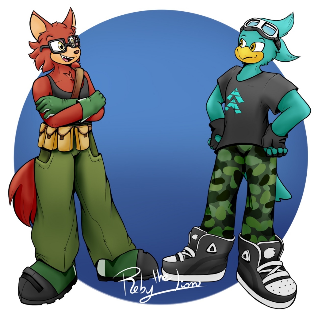 Crimson stopped talking almost immediately when he turned towards the source of Jet’s voice. He couldn’t make sense as to what exactly he was looking at. It looked like some kind of freaky anthropomorphic bird creature with cyan-blue feathers, sitting just a ways from him. It wore a black t-shirt with arrows pointing upwards, camo cargo pants, black and white sneakers, black fingerless gloves, and a pair of goggles on its head. The creature rubbed its eyes a little until it blinked, and then looked over at Crimson. It then also had a look of shock that mirrored his level of surprise. There was a silence between the two as they just stared at each other, unmoving.