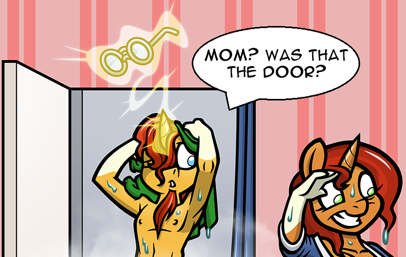 Sunburst is getting ready for his date plans with Moondancer. He has time for a quick shower at least. As long as he doesn't get interrupted.