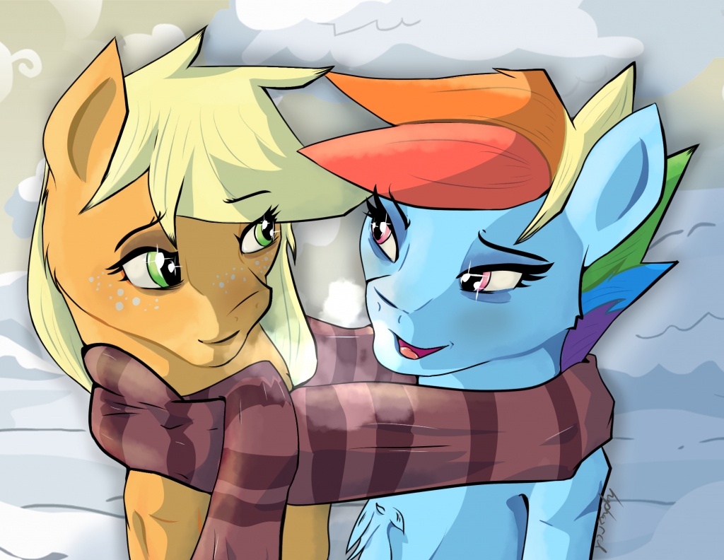 Applejack giggled as a tuft of Rainbow’s thicker pegasus coat tickled her nose. Rainbow pulled back slightly, and kissed Applejack on the cheek.