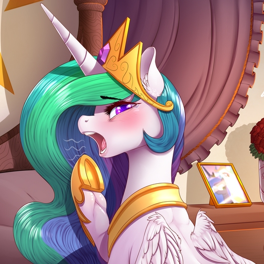 With her heart racing and hind hooves coming to rest on either side of Anon’s head, Celestia faced away. Even with as worked up as she was, excited in every conceivable way, she blushed at what she was doing. Splaying her leg, while flicking her tail to the side, she gave the man an unabashed view of her nethers and groin.
