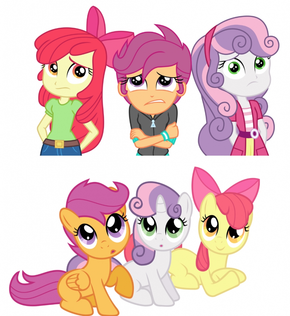 Apple Bloom, Scootaloo, and Sweetie Belle all took several steps backwards, tiny bodies shaking in fear. Apple Bloom, Scootaloo, and Sweetie Belle looked at them, then at each other, and shrugged in confusion.