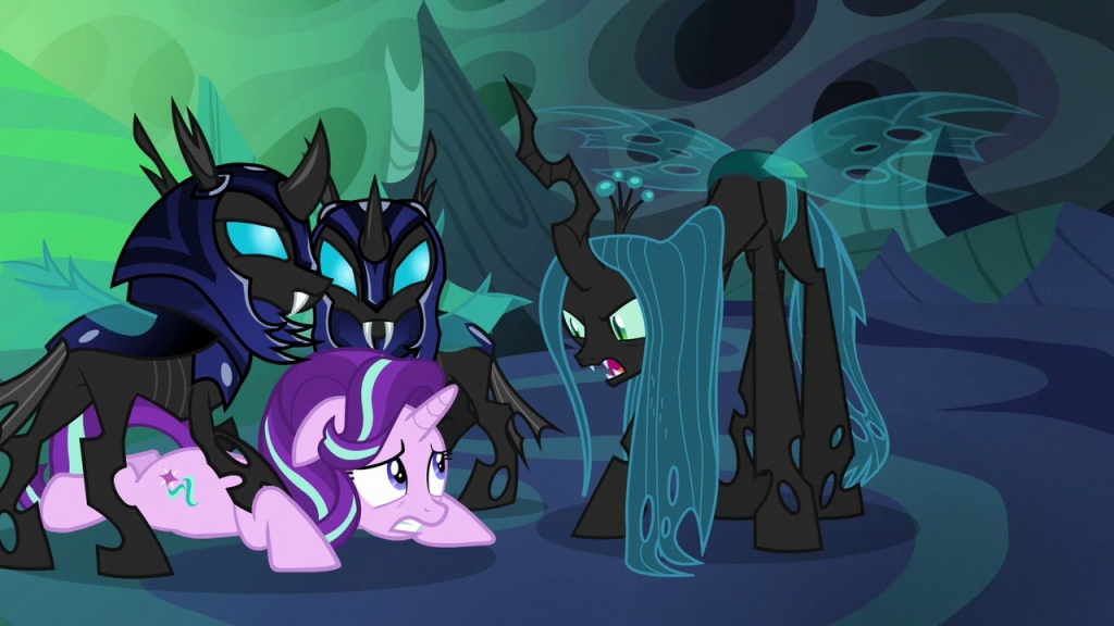 With the rest of the changelings surrounding them, Queen Chrysalis, oozing utter domination, towered over a frowning Starlight while wearing a condescending smirk. She was going to enjoy this, and even Starlight understood how *bleeped* she was.