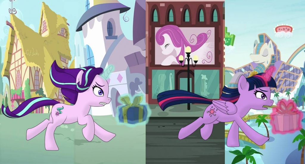 With Twilight’s gift covered in pink-purple wrapping paper, tied in a light-pink bow, and Starlight’s in a blue wrapping paper and tied in a green bow, the trio sped toward Twilight’s castle.